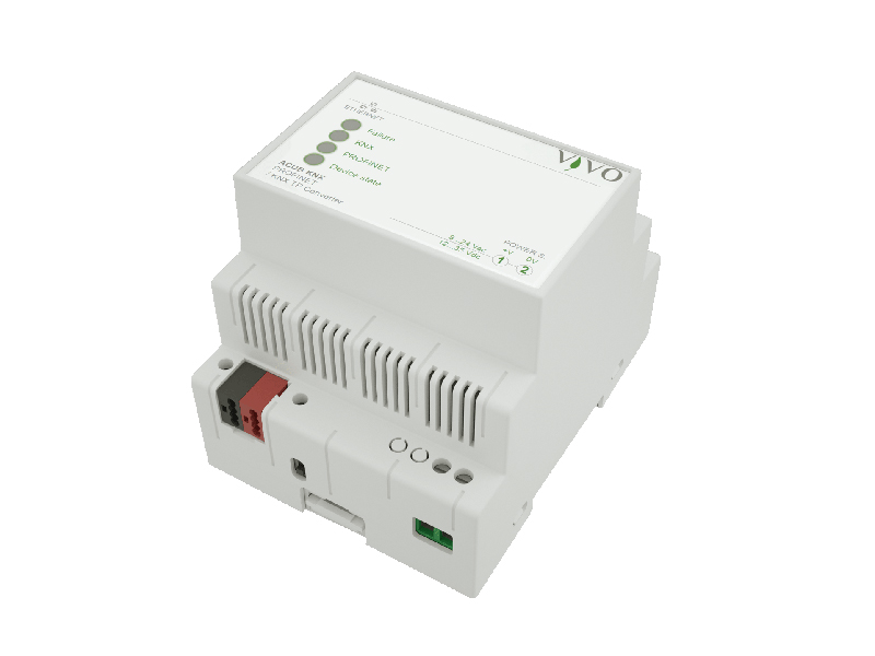 The vivo Profnet Slave ACUB KNX gateway is a KNX modular unit for panel mounting. It allows you to exchange informations with one master devices over an Ethernet network through Profinet protocol. The vivo gateway acts as Profinet slave. The informations exchanged over the Profinet network are updated over the KNX network by means of a twisted pair (TP) communication cable. The device manages a two-way data stream: the Profinet registers can be cyclically read and their value sent as a communication object over the KNX TP network through a multicast communication to configured group addresses. The data update over the KNX network can be done cyclically and/or on event of change of the data acquired by the Profinet network. Likewise, the vivo gateway can make requests to cyclically readings KNX communication objects or acquire their values during data exchange over the bus. Cyclically or on event of change of the communication objects, data are written on the Profinet registers of one or more configured devices. As for KNX communication, 1-bit, 1-byte, 2-byte and 4- byte communication objects can be acquired: internal conversion functions allow you to convert the informations from and to 16-bit foating point values (DPT 9.xxx). Configuration is performed through a PC application software which communicates through the integrated Ethernet port. The application software ets fle is available for download at www.vivoknx.com.